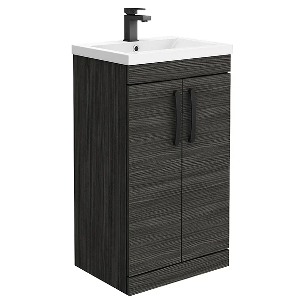 The Brooklyn black modular furniture range combines up to date looks with practical storage. Features two soft close doors and provides plenty of storage space for toiletries, the Brooklyn 500mm wide floor standing vanity unit is perfect for adding modern style to any bathroom. This high quality black textured wood effect vanity unit is supplied with a smooth white gloss vitreous china basin. All units are provided with quality matt black handles.