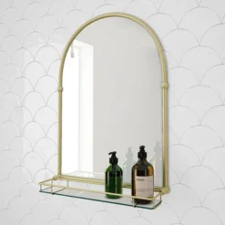 This Chatsworth Traditional Arched Mirror with Glass Shelf will bring a feeling of light and space to your bathroom. The classic arched shape of this 490mm wide traditional bathroom mirror is simple and elegant, with a polished chrome frame for additional dazzle. The design of this chrome bathroom mirror includes an integrated glass shelf and chromed guard bar for keeping toiletries handy or adding your own design detail to put your stamp on the piece. The chrome bathroom mirror with shelf comes with fixings for a simple installation, so your bathroom will feel bigger and brighter in no time at all with this Chatsworth mirror on the wall.