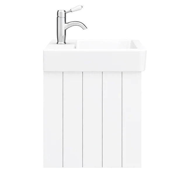 The Chatsworth traditional 560mm wide wall hung satin white vanity unit with gloss white ceramic basin, Victorian inspired design with a modern twist. The Chatsworth range of charming bathroom furniture features classic styling with a satin white finish cabinet and tongue-and-groove side panelling.