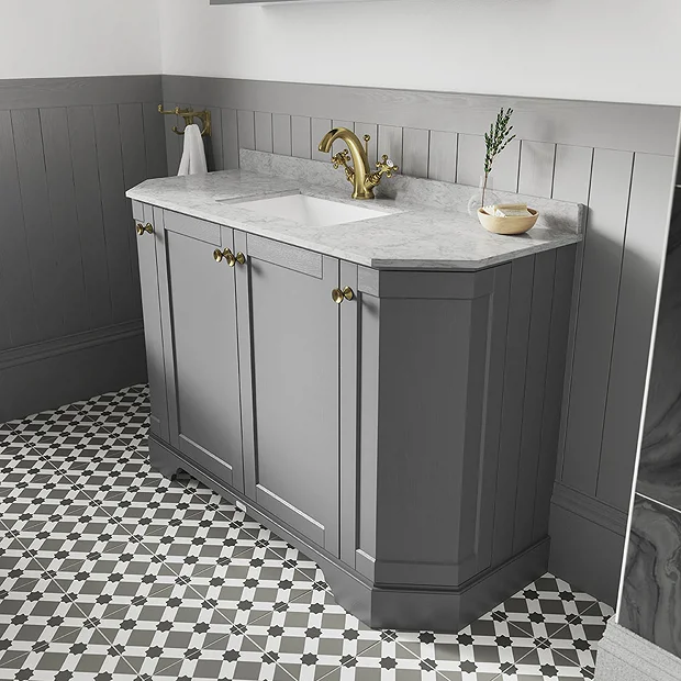 Old London furniture is the epitome of traditional design. This Art Deco styled Storm Grey 1000mm Angled Cabinet features soft close doors which limits the daily wear and tear and provides a quieter closing action. The luxury Grey polished marble top achieves a timeless, classic look. This art deco vanity unit is ideal for creating a period look in your bathroom, with it’s clean classical design blending beautifully with Old London’s range of traditional bathroom furniture.